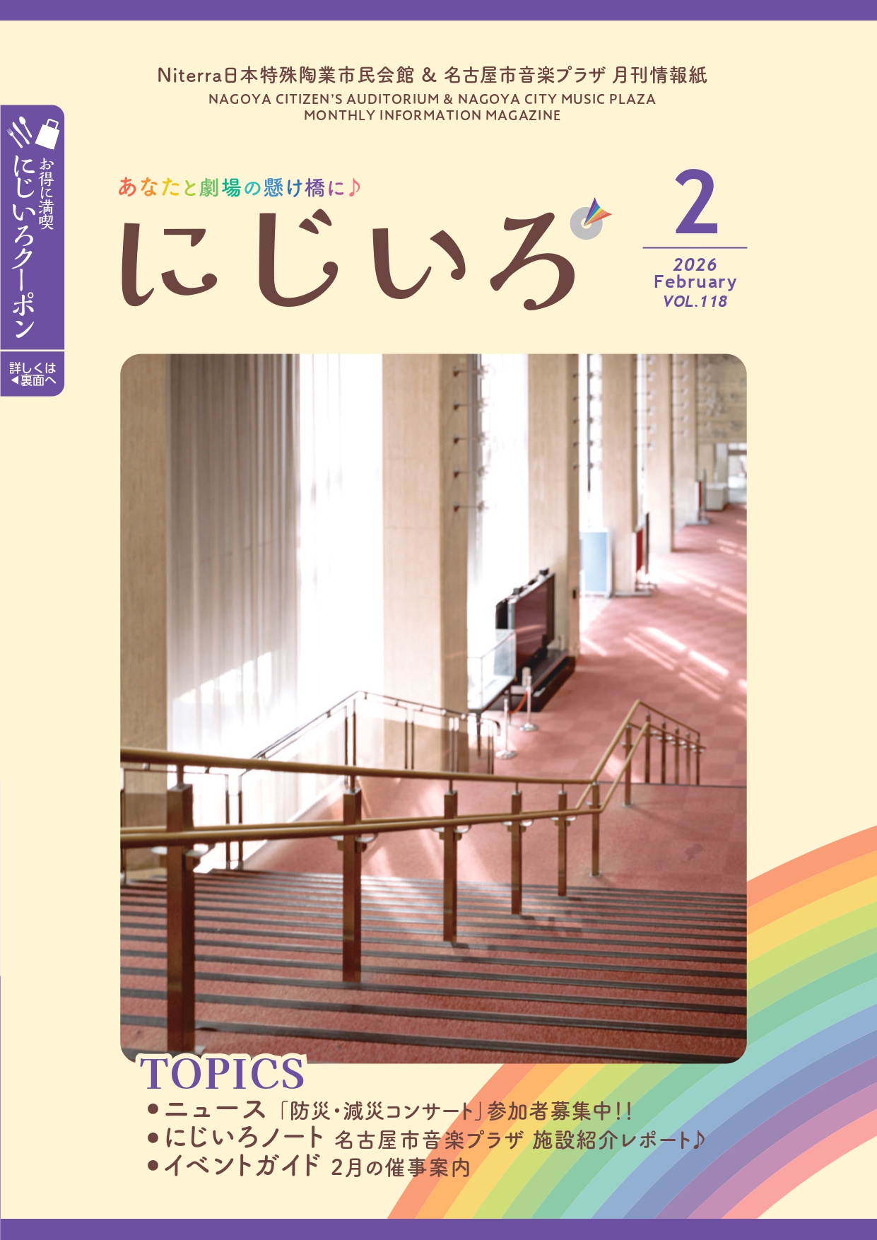 ニュース ・『防災・減災コンサート』2/17(火)まで参加者募集中!! ・『うたフェス・なごや2026』2/23(月・祝)開催♪ にじいろコラム(隔月交代) ・吹部Diary ・この音楽用語なんて読む? にじいろノート(ピックアップ) ・名古屋市音楽プラザを知らない人のための 施設紹介レポート♪
